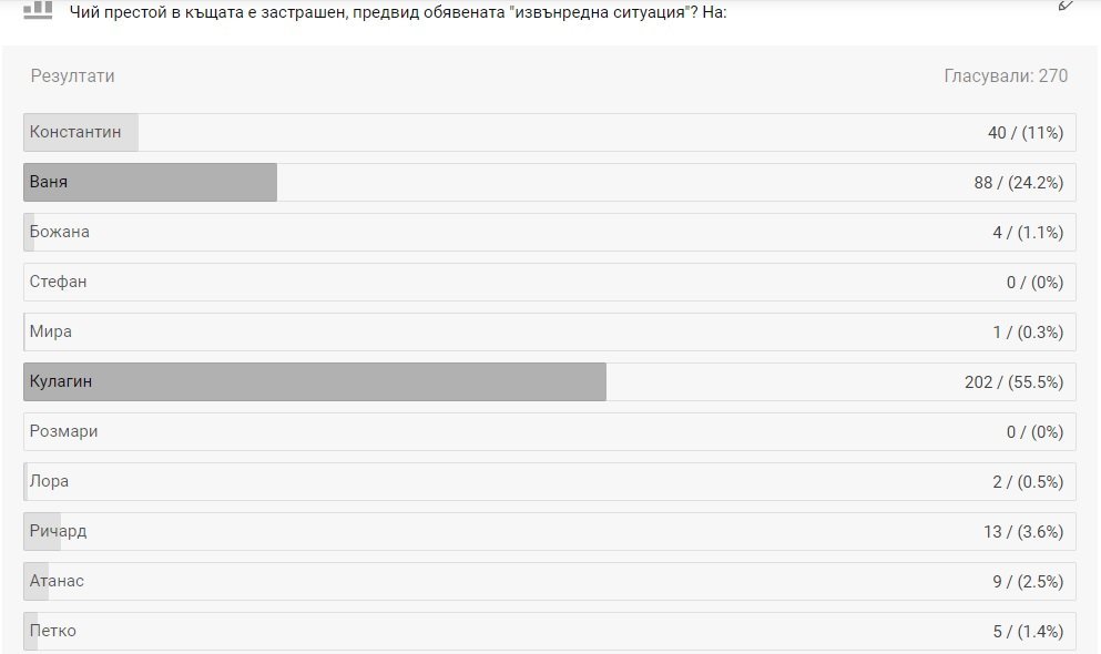 Чувствам се някак омерзена от този епизод, предизвестения вот,  от коментарите, коментаторите. Както винаги различният е натикан в ъгъла. И под различен не визирам дали К е гей или не - това изобщо не ме вълнува. Единственият, който имаше смелост да казва това, което мисли остана използван и едва ли не позорно изгонен след някакво измислено гласуване.Надявам се да си вземе хонорара и да си е договорил добър такъв. Заслужава го. Надявам се и наистина да има кой да го защити сега от всички ненормалници, които ще го погнат. Такъв ярък характер, завидно самообладание и желязна психика не съм виждала на екран. Успех и дано да не го смачкат.