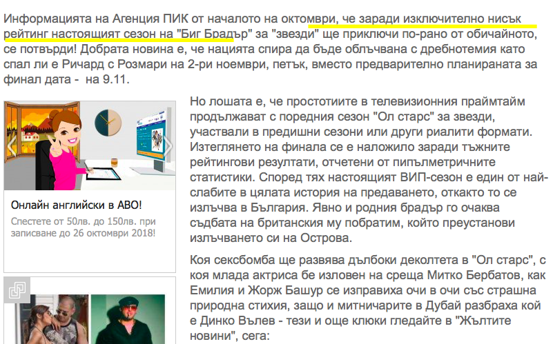 В жълтите вестници пише, че поради слаб рейтинг ще завършат ББ по-рано...