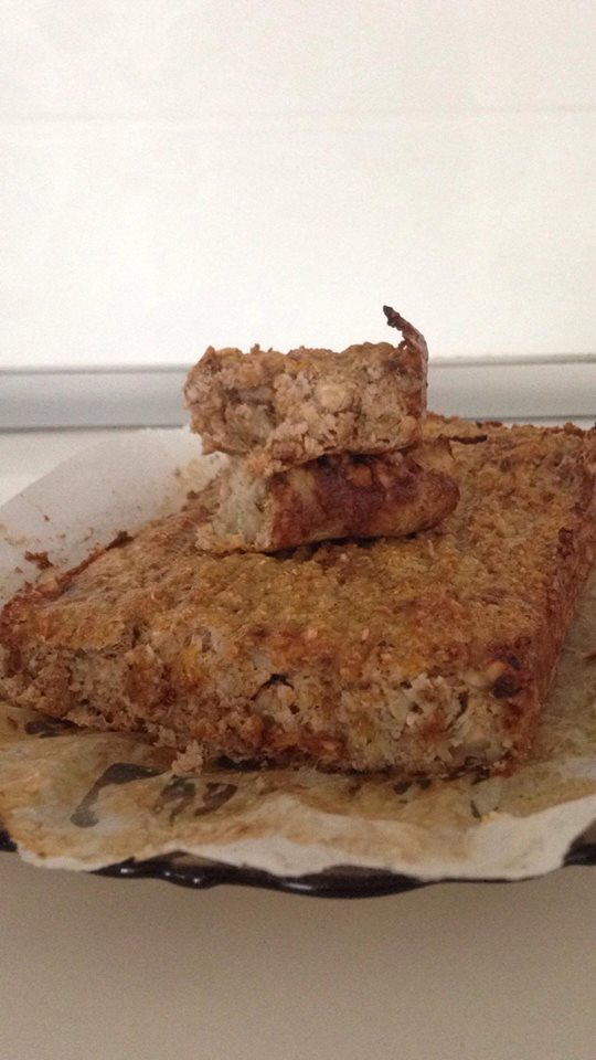 Жаки, всичко на око забърках аз- останало парче тиква, шепа орехи на едро, боцнах с вилица в буркана с кокосово масло и каквото падна от него, парче краве масло, кокосови стърготини, 3 яйца, канела, 1 зелена кисела ябълка(аз я изстисках и махнах малко от сладостта ѝ, но следващия път няма да го направя). От ябълката и канелата ухае прекрасно. Извинявам се за снимката.
