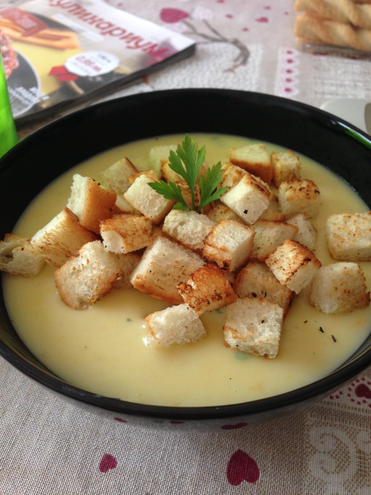 От мен за обяд картофена крем супа с кротони. 😊