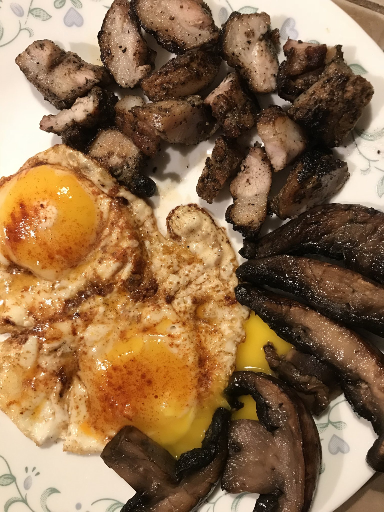 Бърза вечеря - яйца на очи, свинско на тиган, гъби.