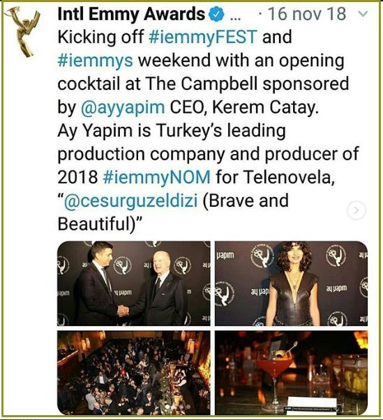 Продюсер телекомпании Ай Йапым Керем Чатай устроил частную коктейльную вечеринку по случаю номинации на премию International Emmy Awards. Напомним, что сама церемония пройдет в Нью-Йорке 19 ноября. Сериал Джесур и Красавица был номинирован в категории "лучшая теленовелла". В прошлом году Чатай уже получил заветную статуэтку за сериал Черная любовь. Однако в этом конкуренцию ему составляет турецкий проект Невеста из Стамбула. Поскольку исполнитель главной роли Кыванч Татлытуг в настоящее время занят на съемках нового сериала телекомпании Ай Йапым Столкновение, он не смог присутствовать на вечеринке. Зато там были режиссер Али Билгин, автор сценария Эдже Йоренч, Туба Бюйюкюстюн и ее возлюбленный Умут Эвирген. Напомним, что Туба начала встречаться с Умутом как раз на съемках сериала Джесур и красавица, еще будучи замужем за Онуром Сайлаком. Часть сцен сериала были отсняты в ресторане любовника актрисы, так что он по праву может присутствовать на церемонии как приложивший руку с созданию данного проекта.