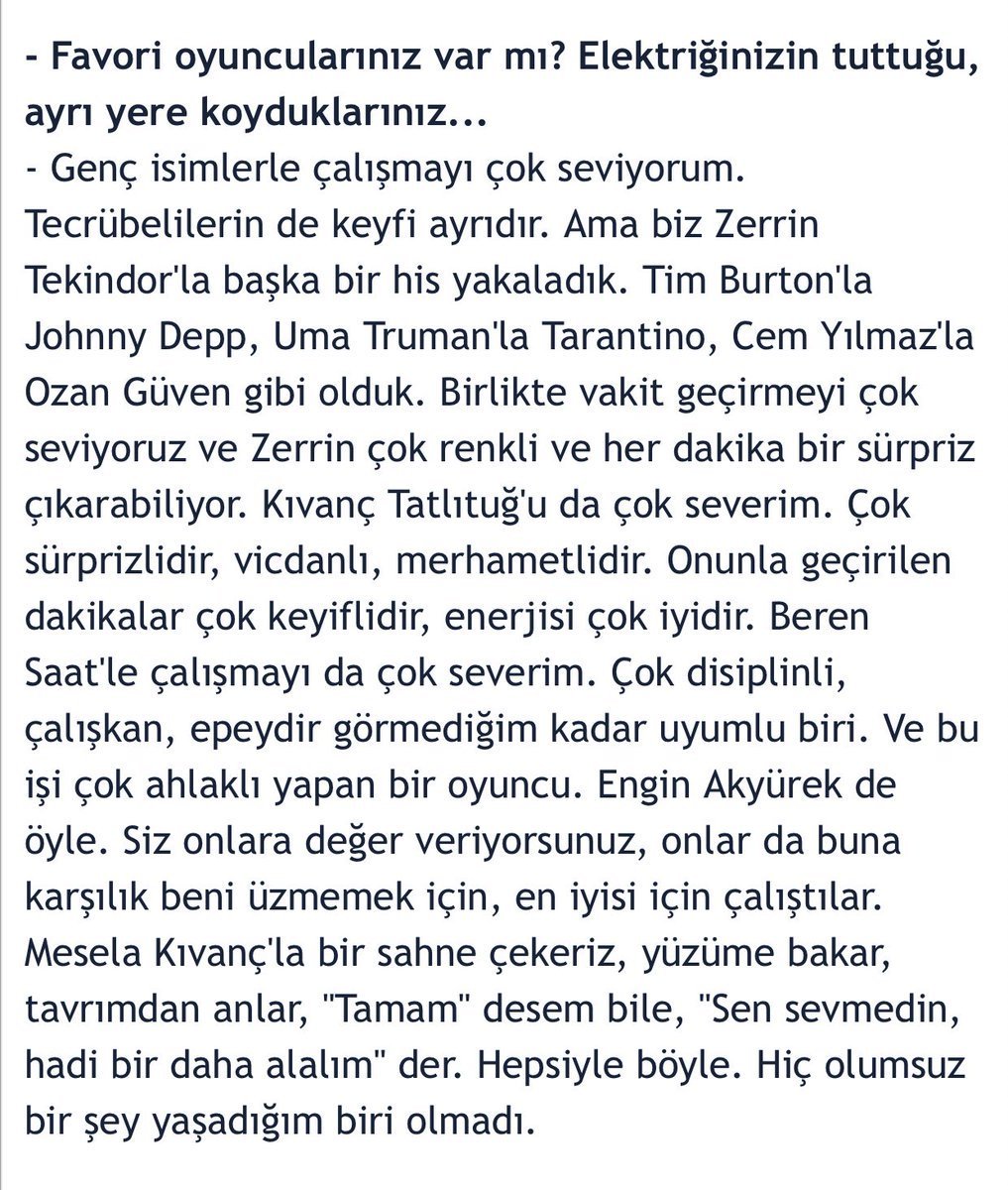 Къванч играеше в "Перла", една моя приятелка ми го показа - "Припадам по това момче". После, докато пишех "Менекше и Халил" започнах да си мисля за Къванч, пред очите ми бе пресъздадения Халил. После като бяхме един до друг с него, не можах да отделя поглед от очите му. Не съм се запознавала, но Таркан бил същия. Толкова магнетизъм има в Къванч и по неподправеността му си паднах. Много истинско и умно момче.