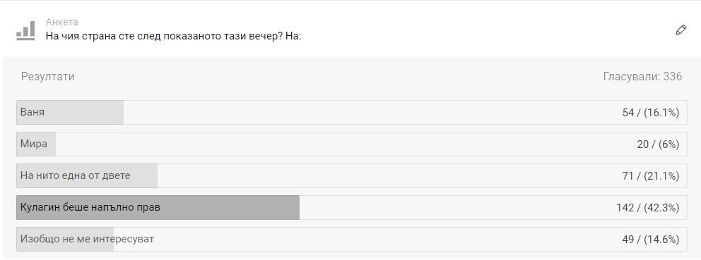 Цял сезон чета темите и само гласувам в анкетите понеже някак ми изглеждаше "тролски" да се включа с коментари чак накрая на сезона. Но споделям преобладаващите нагласи в темата, не вярвах, че чак толкова ще се отрази излизането на Кулгаин, но някои от последните епизоди са почти негледаеми от повторения. Та, не се сдържах да не споделя, че отдавна не ми се беше случвало да нямам фаворит при наличието на толкова останали участници, но уви.