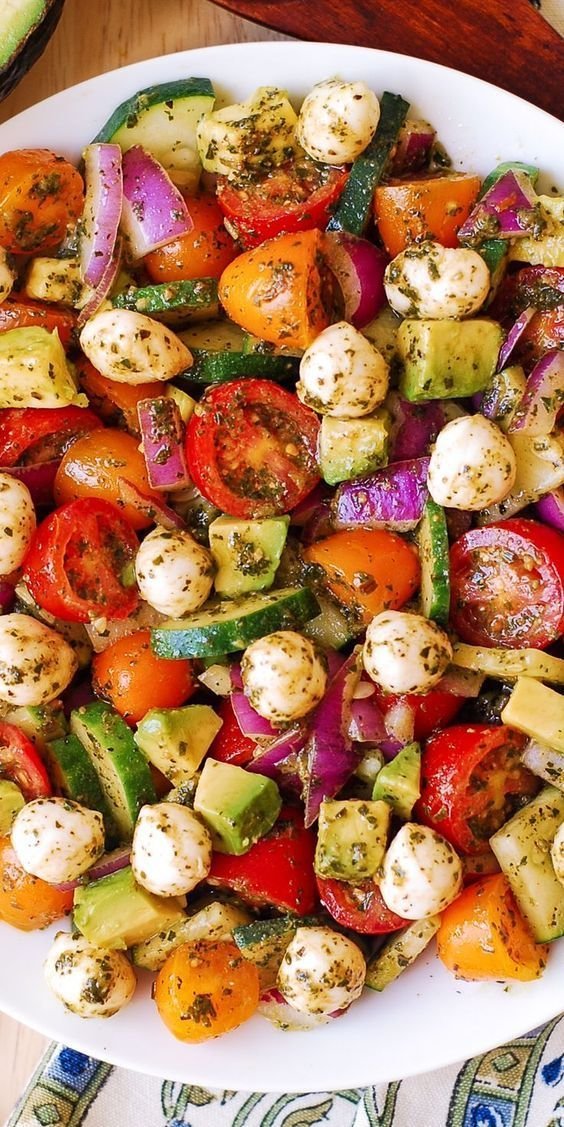 Салата с авокадо-чери домати,авокадо,краставица,морков,червен лук,моцарела,зехтин,сол,риган.