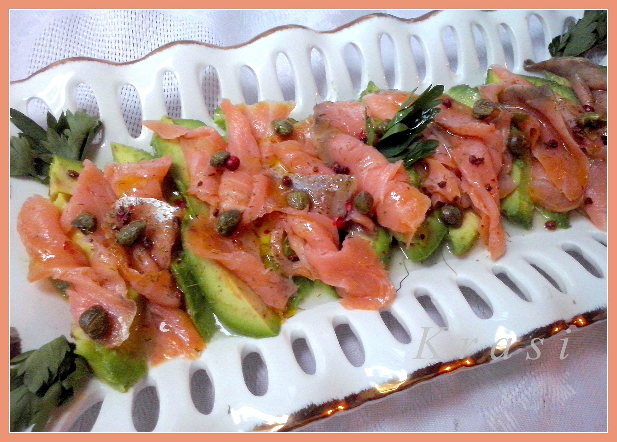 предястие-авокадо, пушена сьомга, каперси, подправки, дресинг