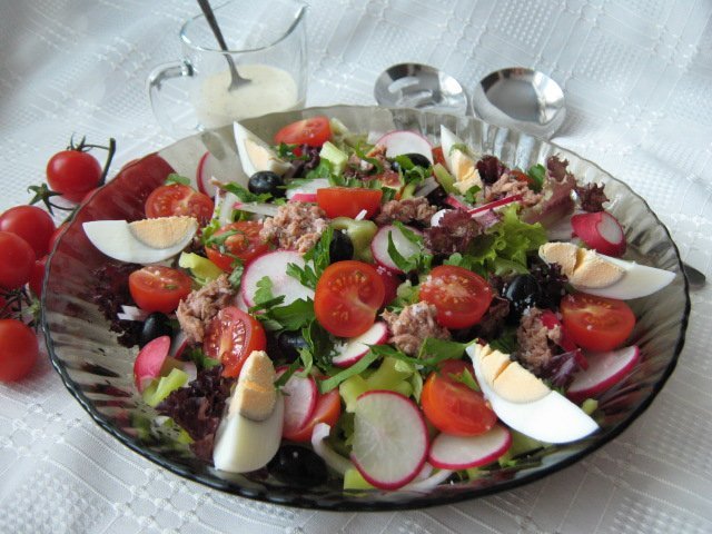 салата за фитнес маниаците-зелена, с чери, яйца, репички, риба тон