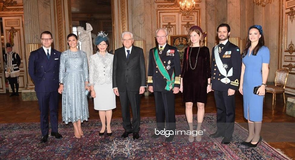 Началото на тридневното посещение на президента на Италия в Швеция. Президента е с дъщеря си, която изпълнява ролята на първа дама. Снимката е от официалното приемане, с последващ обяд в двореца.