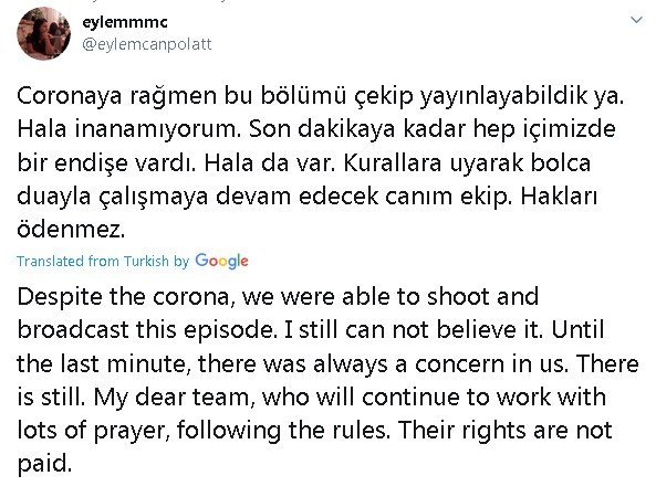 Въпреки корона вируса, успяхме да заснемем и излъчим този епизод. Все още не мога да повярвам. До последната минута в нас винаги имаше притеснение. Все още има. Моят скъп екип, който ще продължи да работи с много молитва, следвайки правилата. Правата им не се плащат.