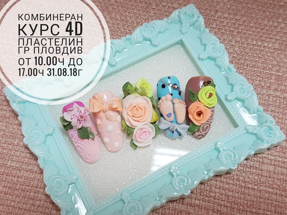 Декорацията с боички и акрилна пудра не се покрива с топ, за да седи матова и релефна. За да е един цвят с нокътя се ползва един и същ цвят боичка. Маже се един слой за цвят на нокът, пече се, след печене боичка е суха и без лепкав слой, прави се плетката с гел, поръсва се с пудра. Пудрата попива в неизпеченият гел, но не залепва за изпечената боя. Пече се. Минава се с четка ако има останал акрил под гънките на нокътя. Готово.