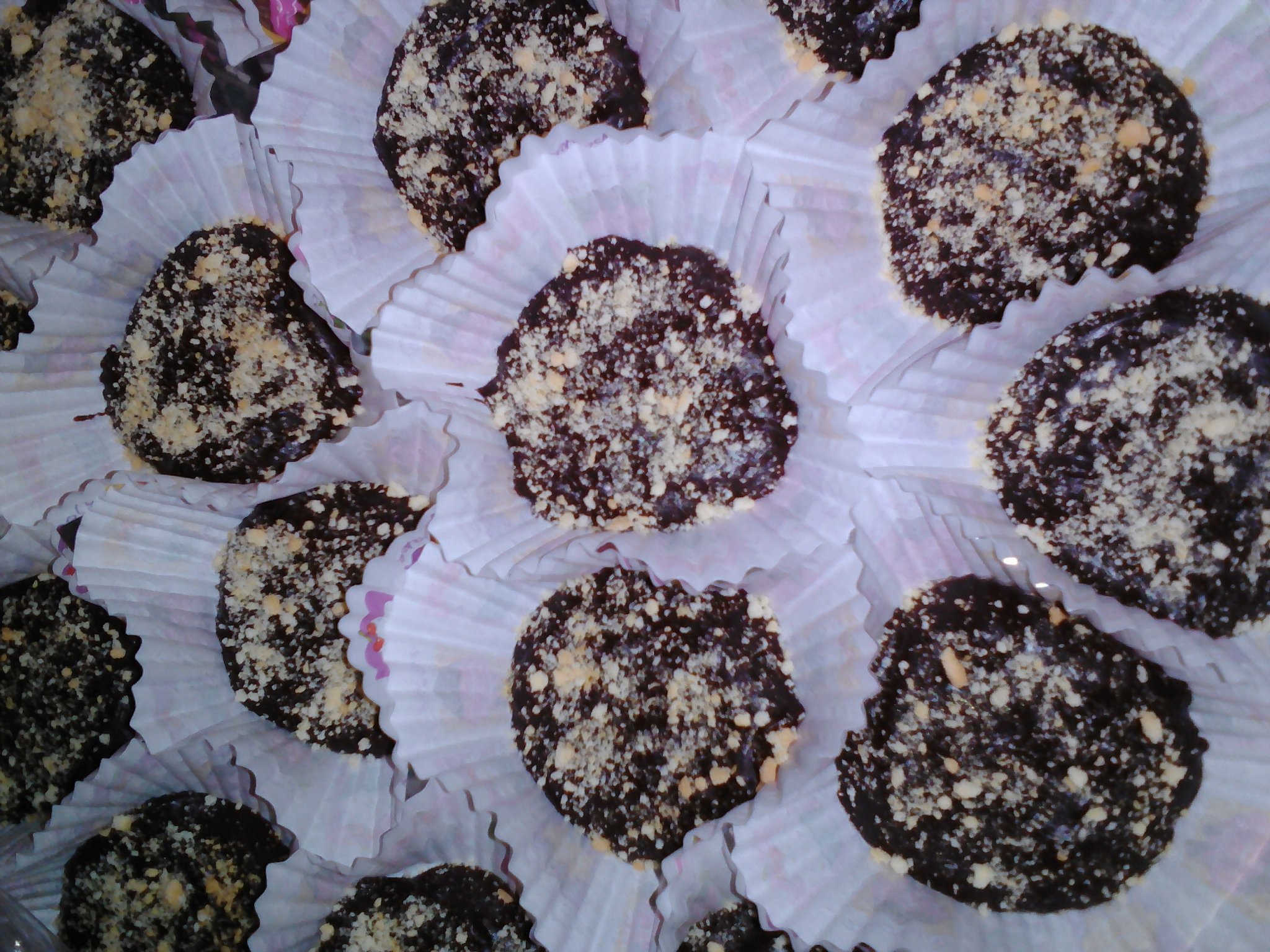 Това е от пресечения кувертюр. Сложих повече сметана и трябваше да е във формички, но се оказа, че за бонбони нямам. Нямах и сурови бадеми или лешници, а само орехи, пък хич не ми се връзват орехите с шоколада, та с малко бисквитка. Отлепват се от кошничката и са чудно вкусни, ама ганаш де, той си е вкусен. Така му се бях ядосала на този кувертюр, че за малко да отиде в кофата, а то...