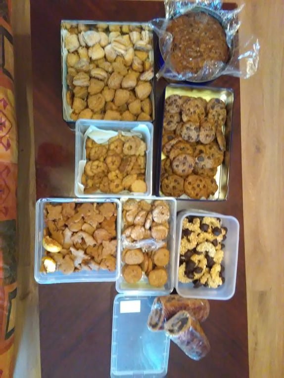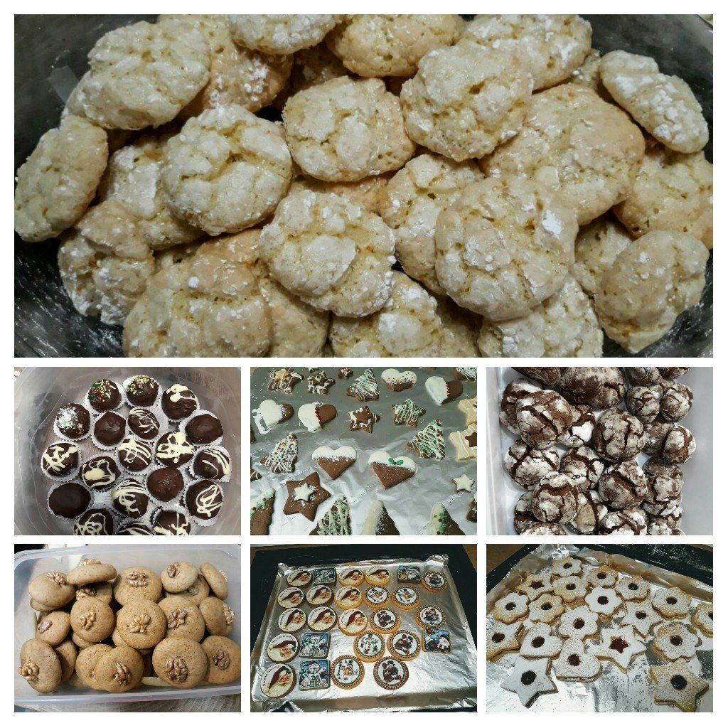 Ето и от мен много грозна снимка с много вкусни нещица. Унгарски Бейгли / с макова и орехова плънка/, балеринки, ричарели, АКК, шприц бисквитки,  бисквити с шоколад, меденки/ без украса още/, бадемови рогчета с шоколад. Понеже всички са с пълнозърнесто брашно и кокосова захар всички са по- тъмнички, но за сметка на това много вкусни