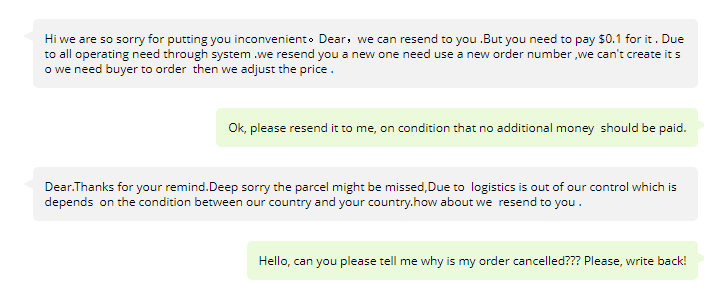 Здравейте, как да процедирам с една поръчка, която първо ми канцелираха, а сега ми пишат, че ако си искам стоката ще трябва да доплатя 0,10 usd допълнителни разходи. Поръчката е на малка сума.