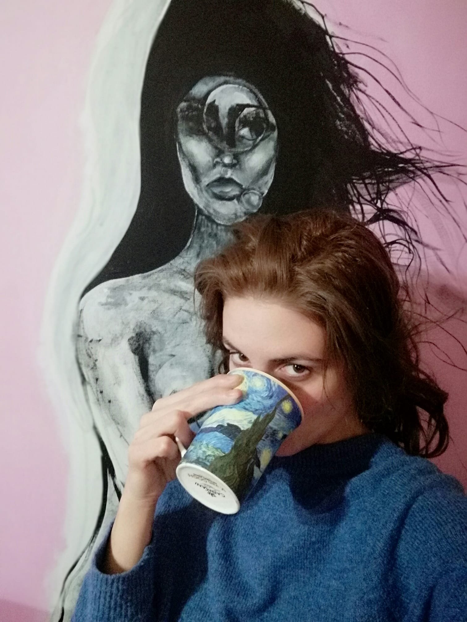Ден 5ти без сън от цикъла 3 месеца "Прераждане и 28 сапунени мехура". Снимки от 5 сутринта. Разходка с Врубел. "Арт" чаша (подарък) пълна с Русский стандарт. Толкова съм "арт", че ше взема да си посегна.