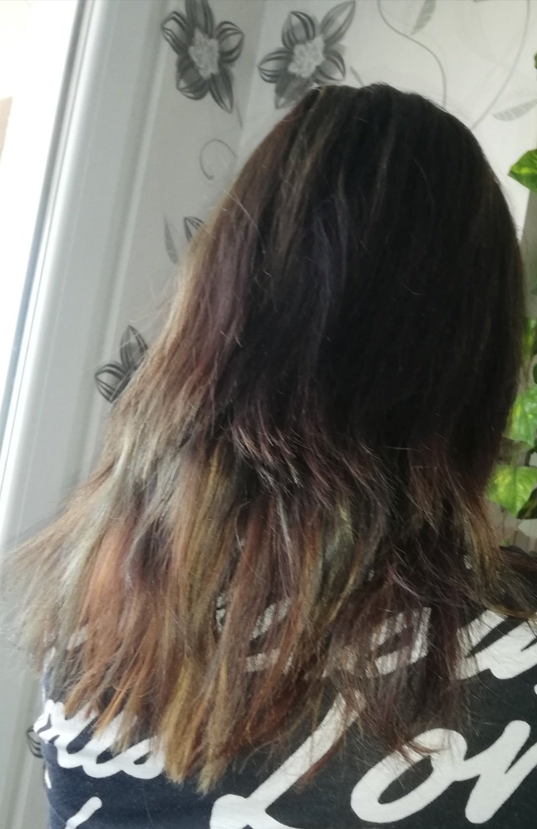 Само от 4ка вероятно ще успее да прикрие всичко това. Не знам с какъв оттенък предвид зелените кичури в косата ми.