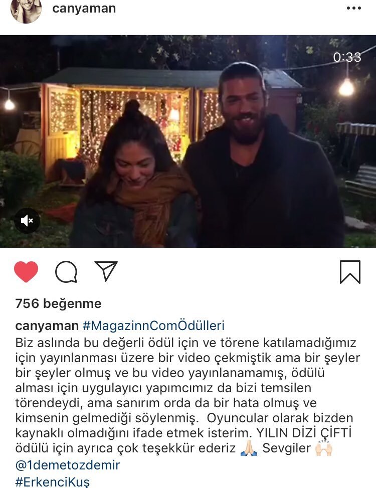 Видео-благодарность от Джана и Демет за премию от #MagazinnСom в номинации "Лучшая сериальная пара года" .