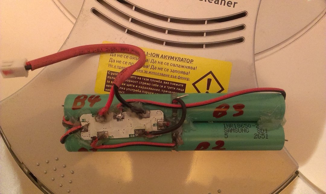 ЗАДЪЛЖИТЕЛНО Е НОВАТА БАТЕРИЯ ДА СЕ ОКОМПЛЕКТОВА С ДОПЪЛНИТЕЛНА ПЛАТКА BMS, КОЯТО КОНТРОЛИРА ВСЯКА ЕДНА ОТ БАТЕРИИТЕ ПО ОТДЕЛНО И СЪЩЕВРЕМЕННО ЦЯЛАТА БАТЕРИЯ, КАТО ПАКЕТ! ТОВА Е АБСОЛЮТНО ЗАДЪЛЖИТЕЛНО!!!  Огледайте дали оригиналната батерия няма термо резистор (една малка пъпчица запоена-залепена) някъде около самите клетки на батерията. Трябва да я разпоите и да я прикрепите към новата, иначе прахосмукачката няма да я зарежда и ще изписва грешка!