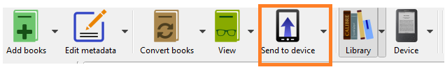 Моят Calibre е 3.22.1, сега има май и по-нови версии. И при мен горе в редичката на бутоните за различните менюта няма send to device, но затова пък като маркирам някоя книга от списъка, мога с десен бутон на мишката да изкарам помощно меню и там има  send to device / send to main memory и така изпращам книга на четеца при включен кабел.