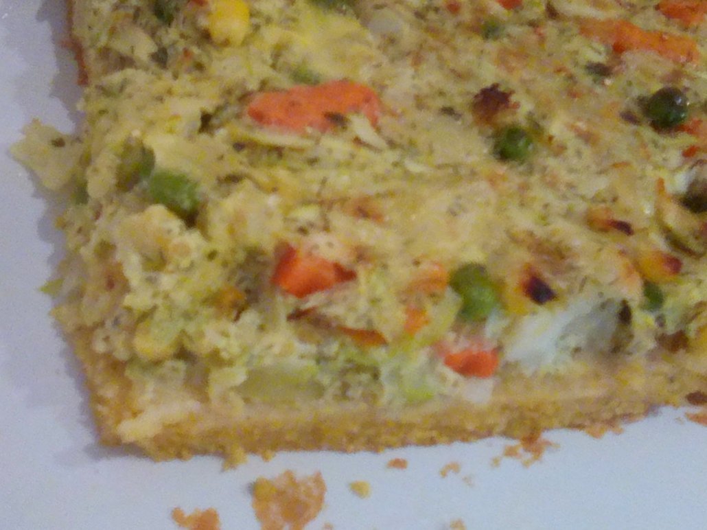 Пай със зеленчукова плънка. Блатът е от царевична полента, малко пшеничен грис, елдено брашно, яйце, сол и олио, а плънката е от задушен лук с грах, моркови, карфиол, настъргната тиквичка, сушен копър, две яйца, малко киноа, кисело мляко.