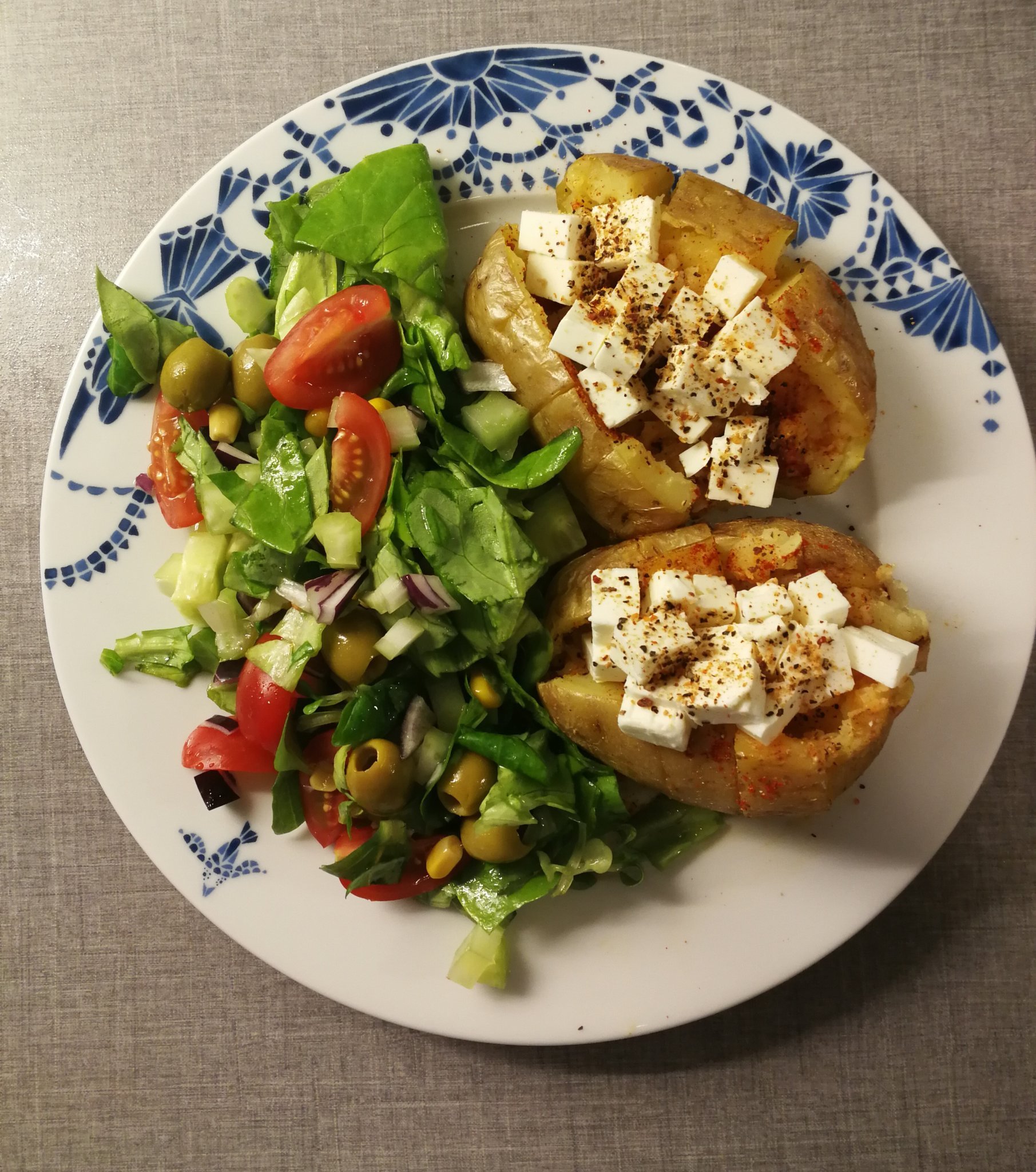 От вчера обедно: зелена салата с червен лук, маслини, домати, краставици, целина, маслини, царевица. И печени картофи със сирене и масло.