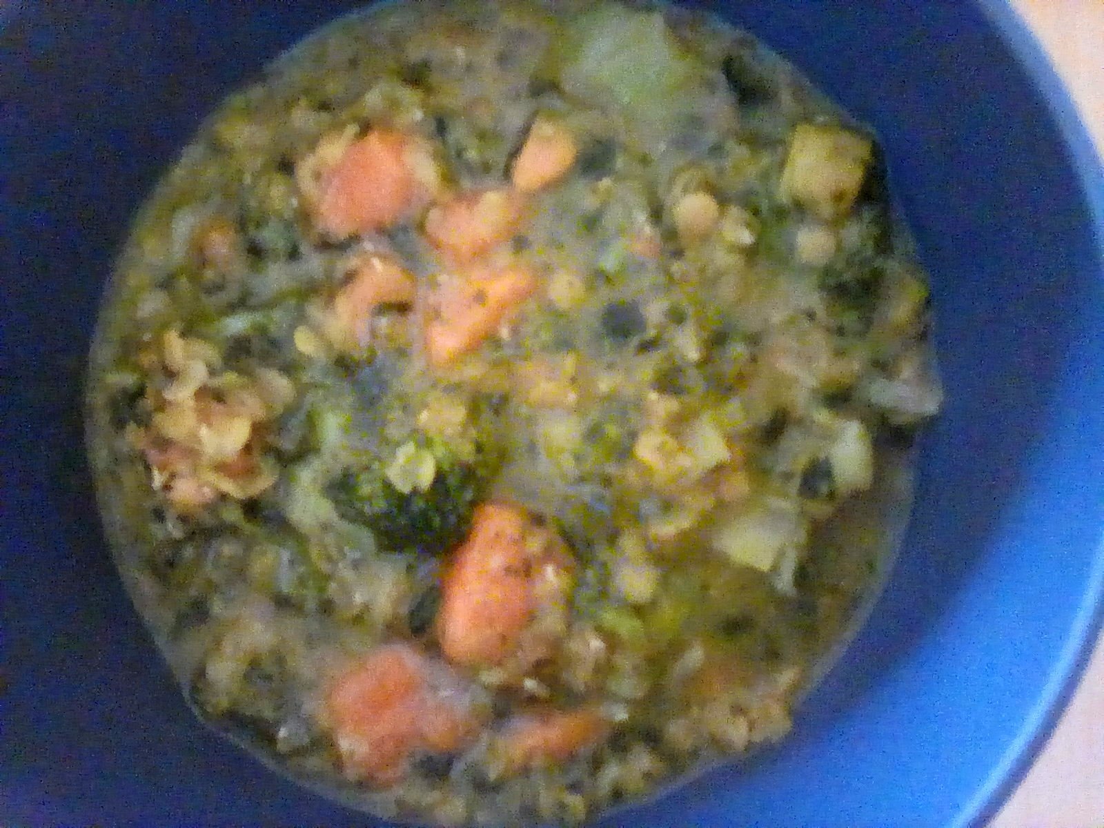 къри червена леща с броколи, праз, спанак и сладък картоф.
