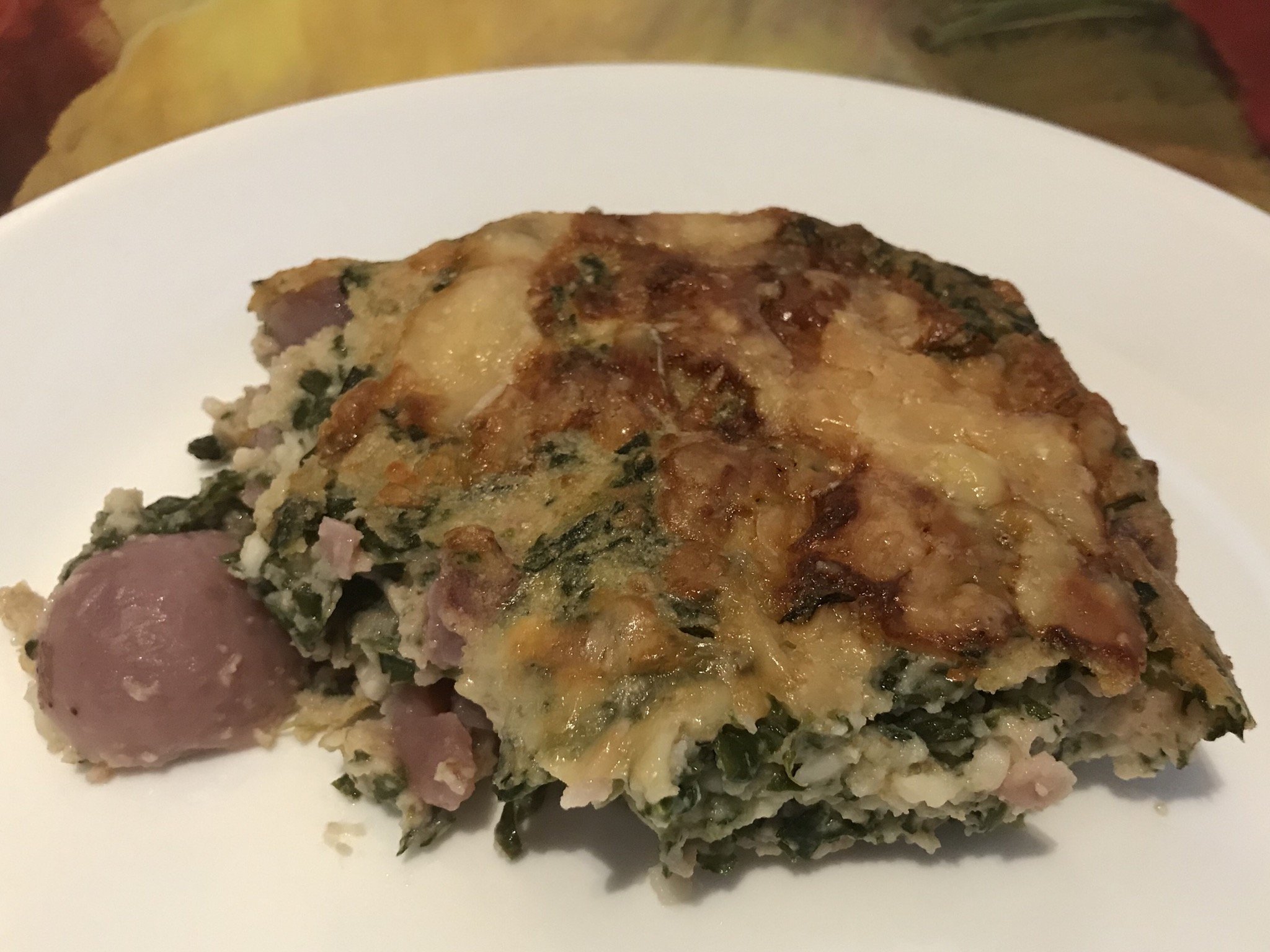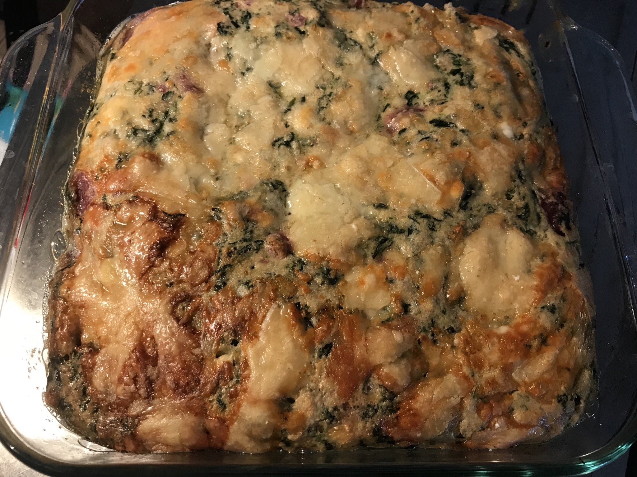 Запеканка с розови картофи, спанак, котодж сирене и сирене грана падано.