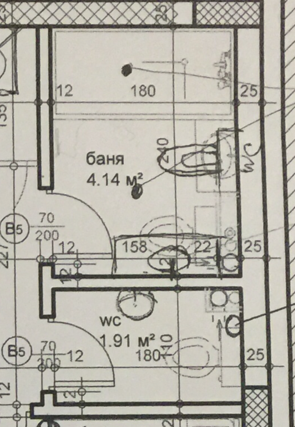 Попринцип така е планирано да го направиме но с тоалетна, в момента сме двама...живот и здраве да сме и трима и повече Simple Smile Сега на тази снимка се чудя дали мивката да е 80см колкото щранга и после да е тоалетна с вградена структура 50-60см и остава 100см място за къпане но това ще е без параван....значи ще са под 100см....или мивката да е към вратата с шанс за 90-100см мивка.