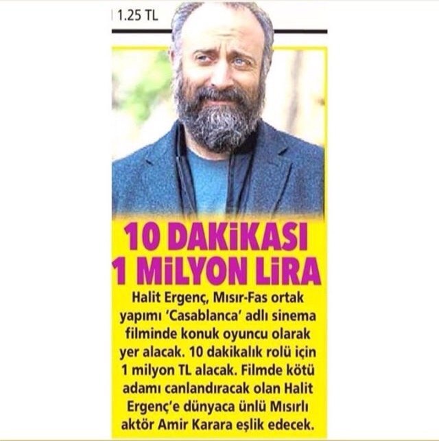 "Известный актёр Халит Эргенч станет гостевым актёром в фильме "Касабланка", совместного проекта Мисир-Фаса. 10-минутная роль получит миллион турецких лир(13.000.000 руб.). Египетский актёр Амир Карара будет сопровождать всемирно-известного актёра Халита Эргенча."