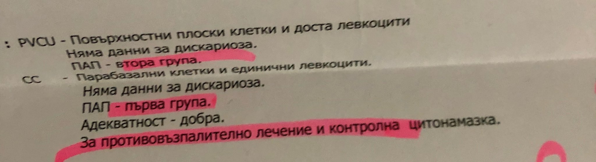 Здравейте,дали някой може да разчете моите резултати? Лекарят ми каза едиснтвено че имам възпаление. Нямам течение нито сърбеж. Лечението ми е 25 дни с глобули - 15 гинопеварил и 10 интимохелп. Въпросът ми е тъй като не успях да де свържа с лекаря дали резултатите са свързани с гъбички и дали според тях трябва да се лекува и партньора ?