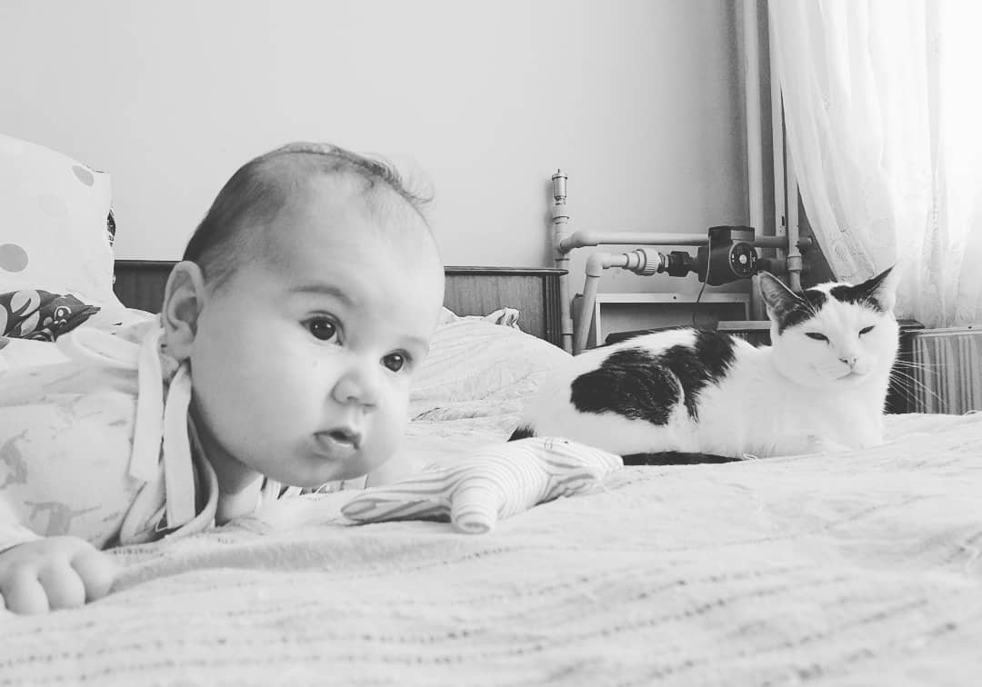 Но още не се върти гръб-корем. От няколко дни слагам разни постелки на пода и така на твърдо по-лесно се врътка.  Ама се успокоявам, защото чета, че ори някои бебета и чак 5-6ти месец може да се случи това. Мойто нали си е дунда, тежат ѝ бузите 😁