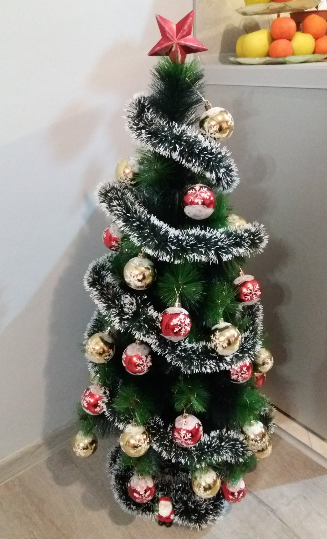 Коледната елха вече е украсена у нас от детето- всички играчки  блестящи, жълти, червени , зелени , сини, бастунчета, панделки, гирлянди-всичко е цветно, но красиво!