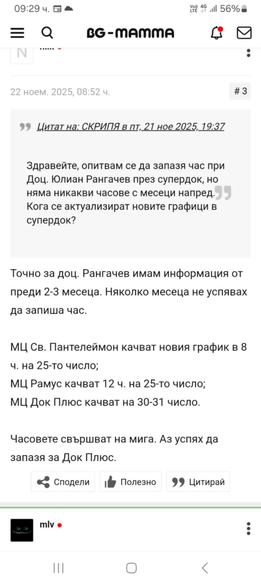 Успях да се свържа с нея и на мен ми каза, че не записва часове, на четни дати след 13:30 на ул. Позитано се ходи и се чака, но явно не е в мц Лора. На 3ти етаж.