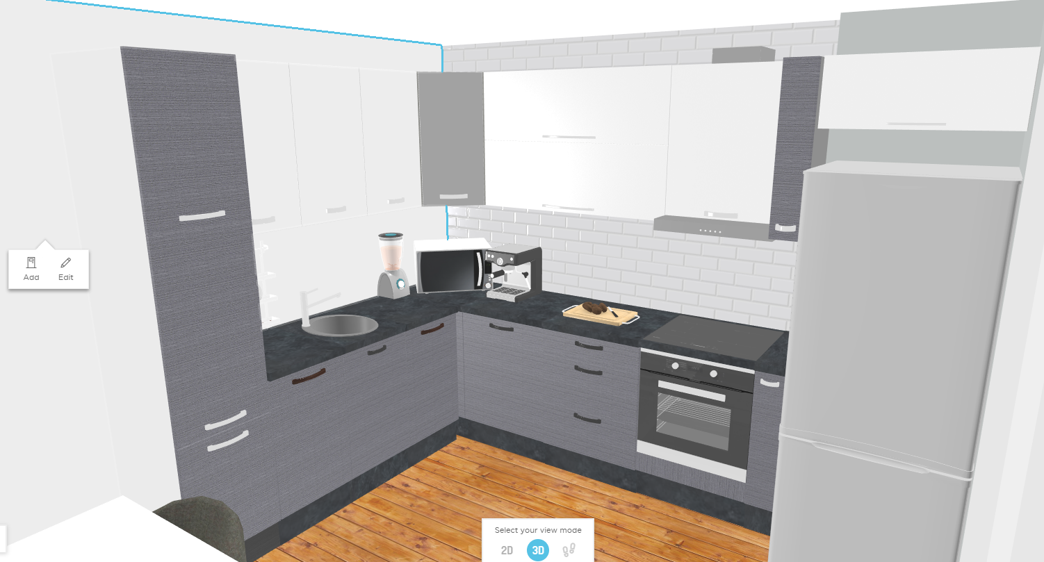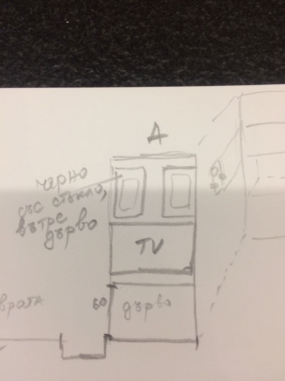 И сега стигаме до двете дилеми със заобикалящите кухнята ТВ секцийка и ниша от другата страна, които съм отбелязала с А и В на първоначалната ми рисунка.