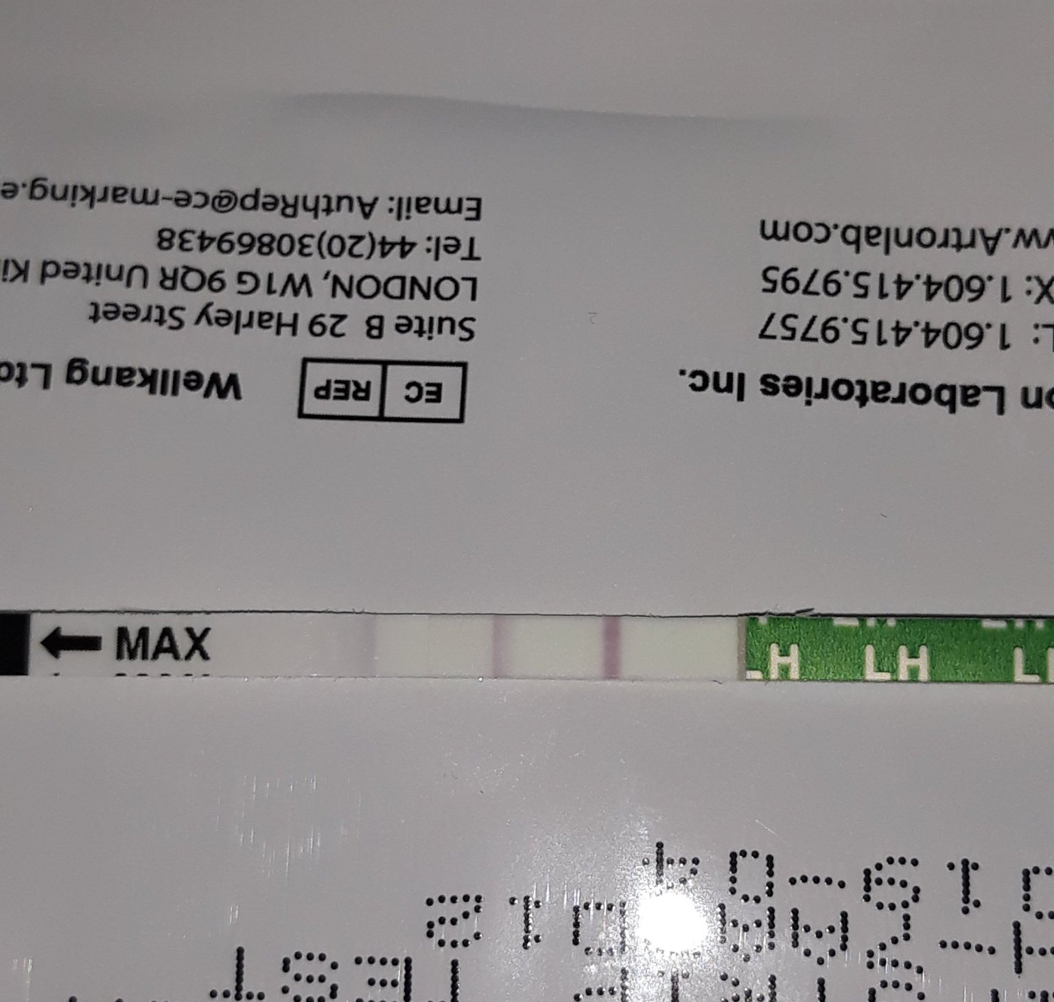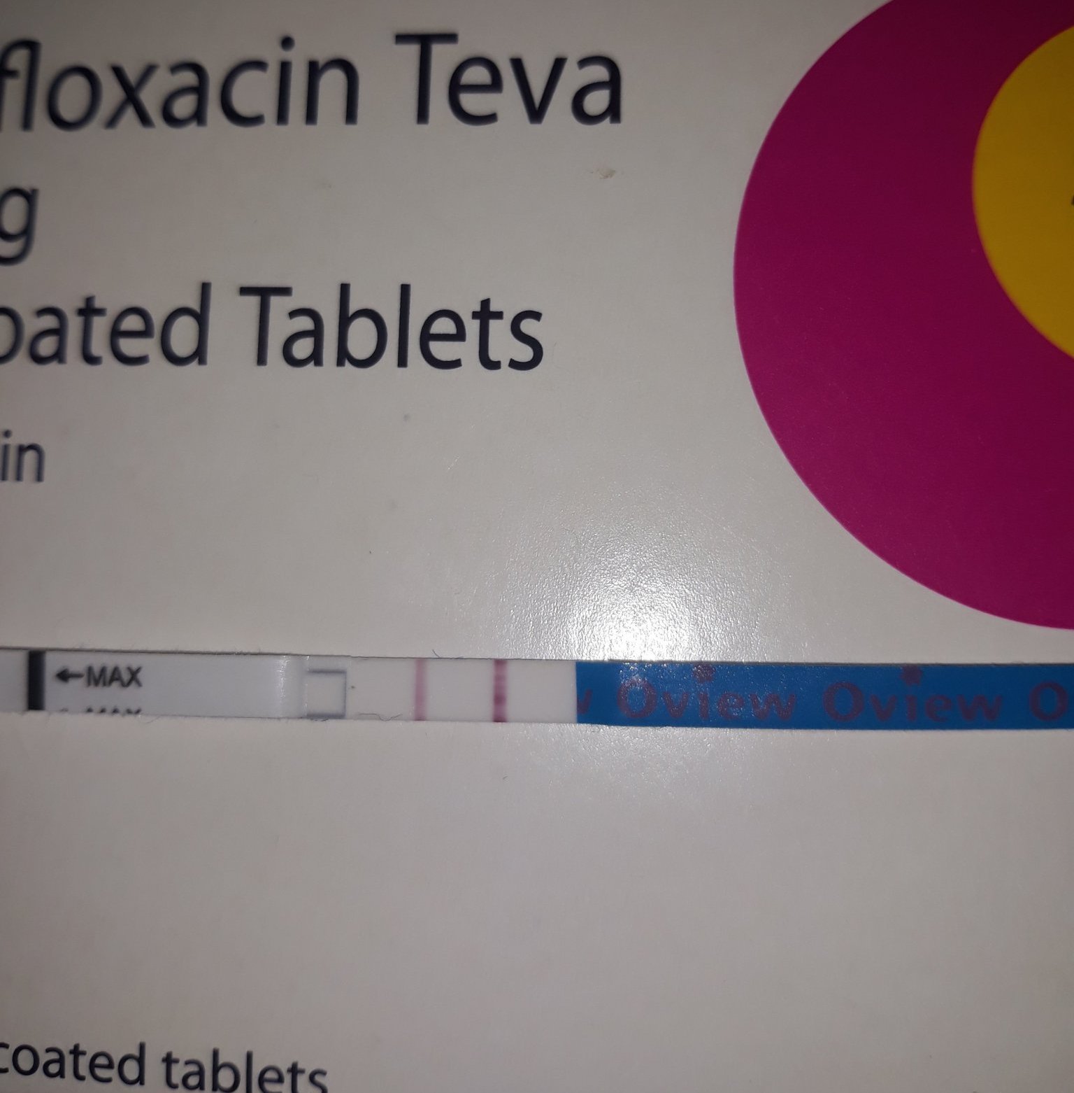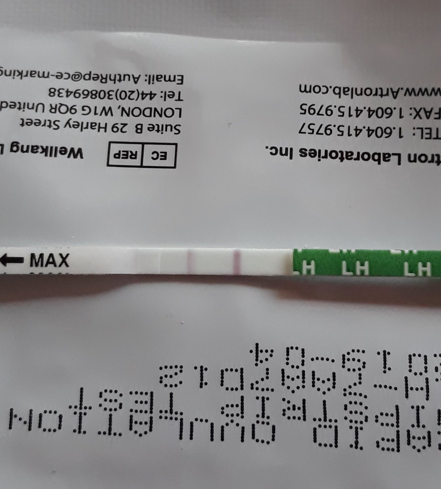 При мен днес отново има леко зацапване, явно още контрастно вещество от снимката, но ЦС ми се струва доста обилна. Взех си две кутии с тестове и направих първия - успокоих се, че не съм я изпуснала прословутата О, защото има отчетлива втора линийка, но още не е наситена.