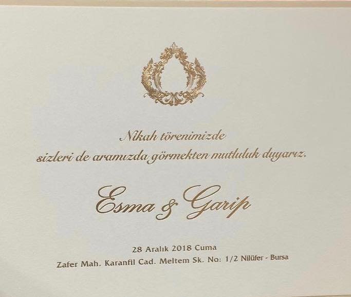 На поканата е написано: Есма и Гарип - Ще бъдем много щастливи, да ви видим ,между нас,на сватбеното ни тържество !