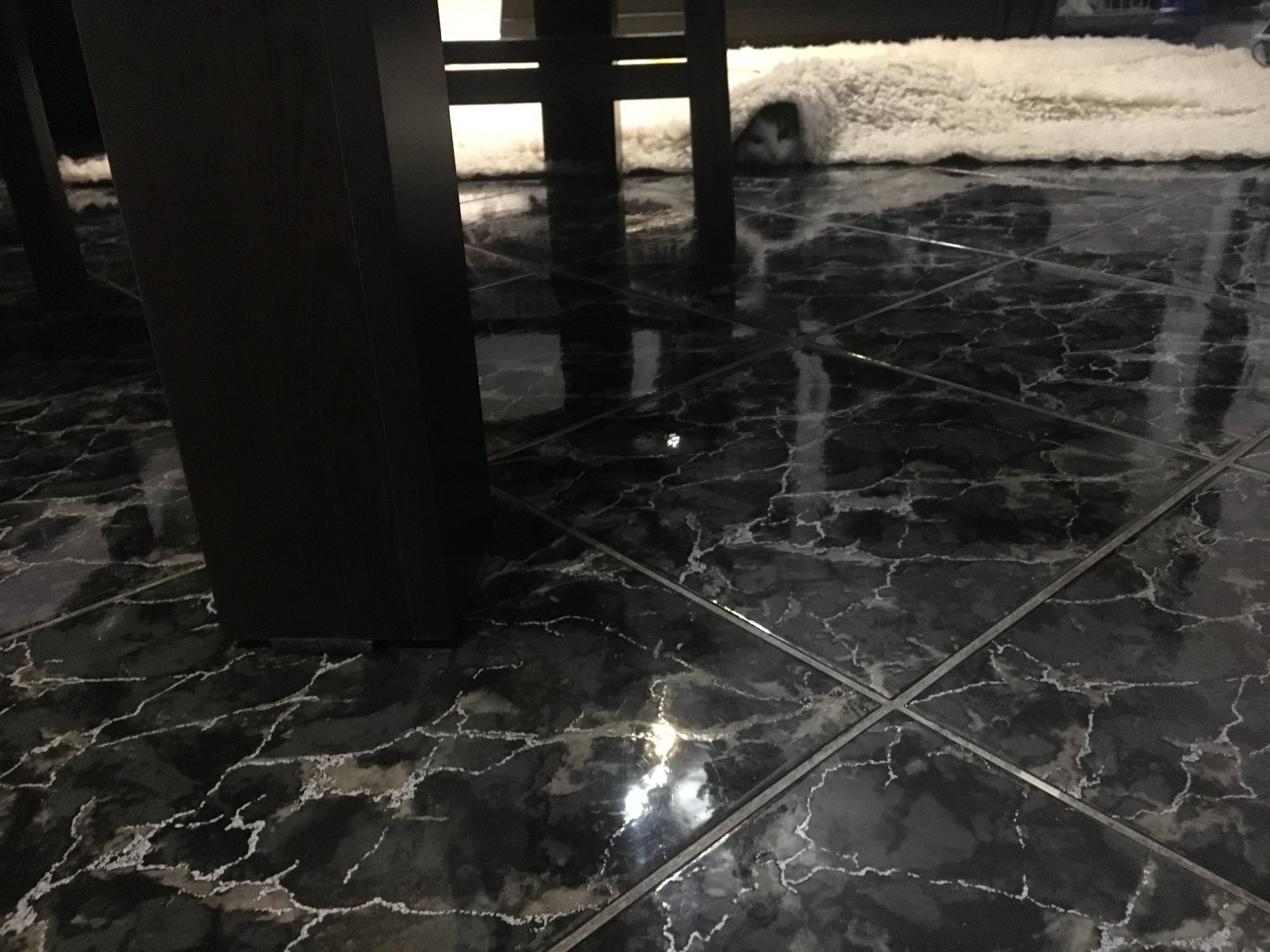 Служебната котка я оставям вътре в халето сега в студовете, с храна и вода. Хитрушата се настанила върху един стиропорен блок до радиатора и не мърда оттам.
