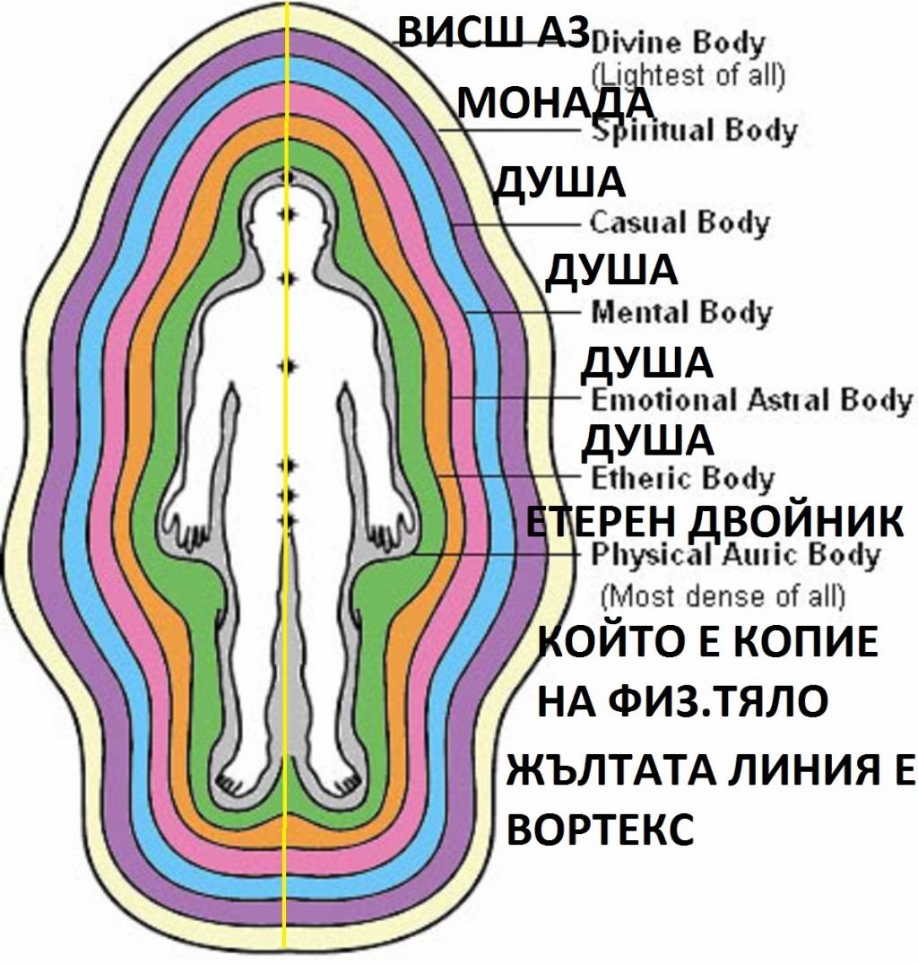Бидейки вси4ки телa(тороиди с вортекси)сa нaсложени едно в друго,то вортексът им е общ и такa вси4ки енергии проти4aт пре3 4овешкото тяло