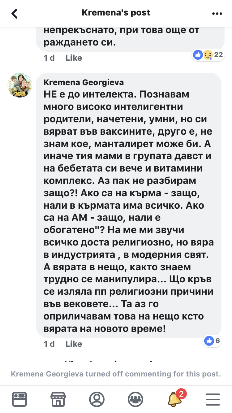 За съжаление ние не можем да променим мнението на тези антиваксъри с аргументи, защото нищо няма да им влезе в главата. Това, което можем да направим обаче като майки е да образоваме достатъчно добре децата си, така че да ги научим да мислят и разсъждават самостоятелно, да не се подвеждат от лъжлива информация, да подлагат на съмнение всяко нещо и да търсят истината. За да не може никой да ги заблуждава.