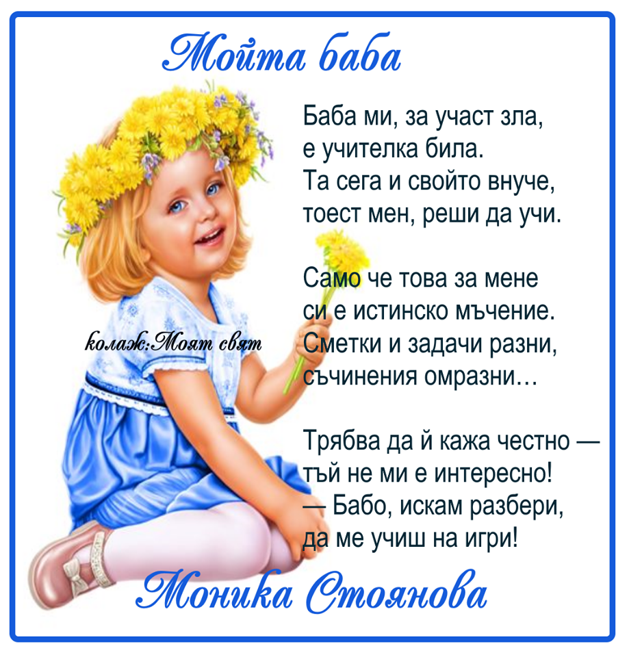 Яне, благодаря за стихотворението! Но при нас е обратно- моята "ученичка' сама иска да учим. Има си една магнитна дъска на стойка, която купувахме с другата баба за РД на батко й. Имаме тебешири  и играта е на "учителки". И така на игра още на 3, 5 г. научи буквите и сега почна да чете  думи с 2 и 3 отворени срички. Задачите ги решаваше  с игра на пиленца, зайчета и други животни, а сега започна да ги пише с цифри и знаци на дъската.Сега  сама си играе на "Не се сърди" с  3 цвята пионки и 3 зарчета.