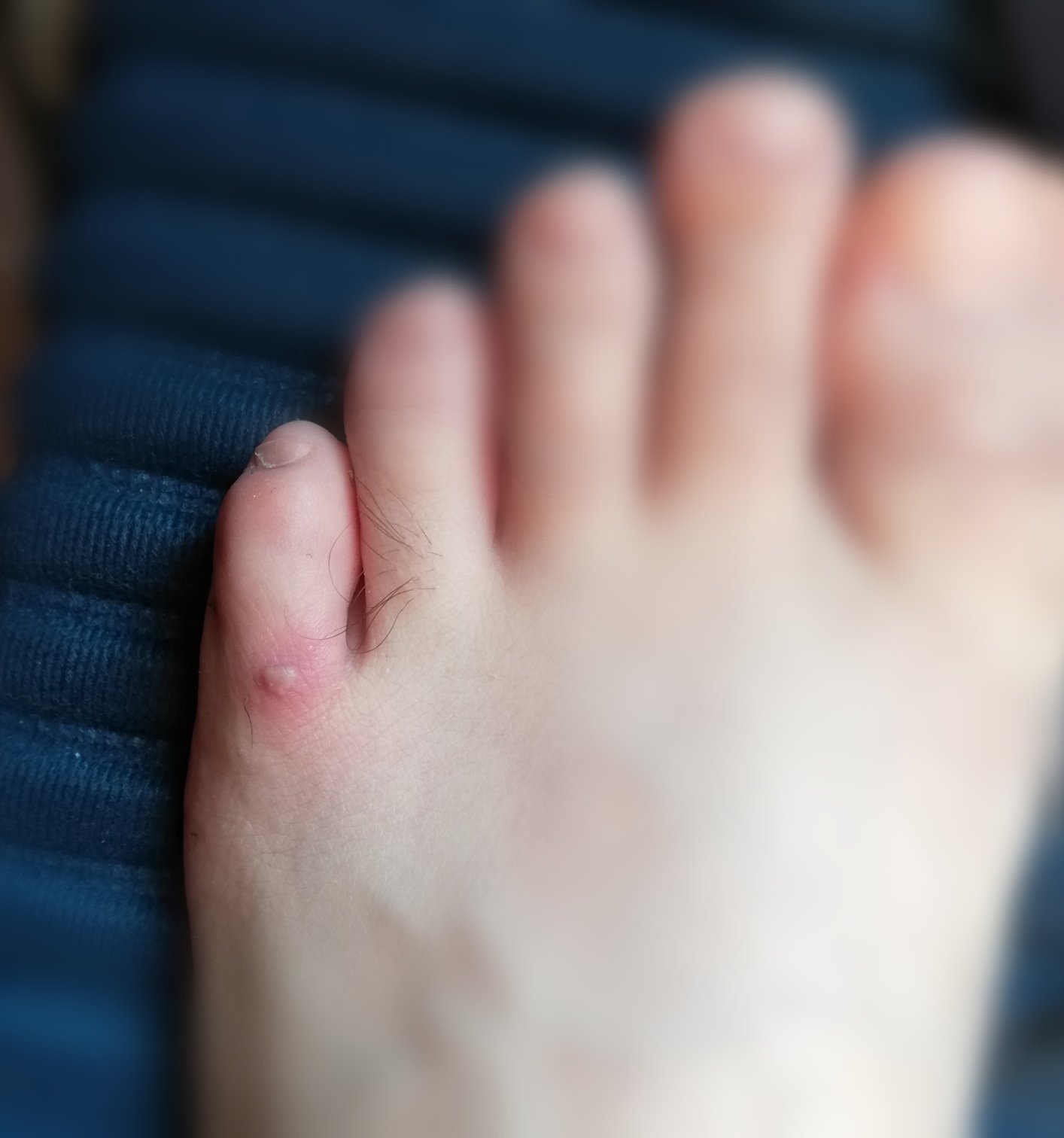 Трети ден, започна като болезнена пъпка (мислех че е от насекомо, но не е), с бял оттенък, сега потъмня, не боли толкова...