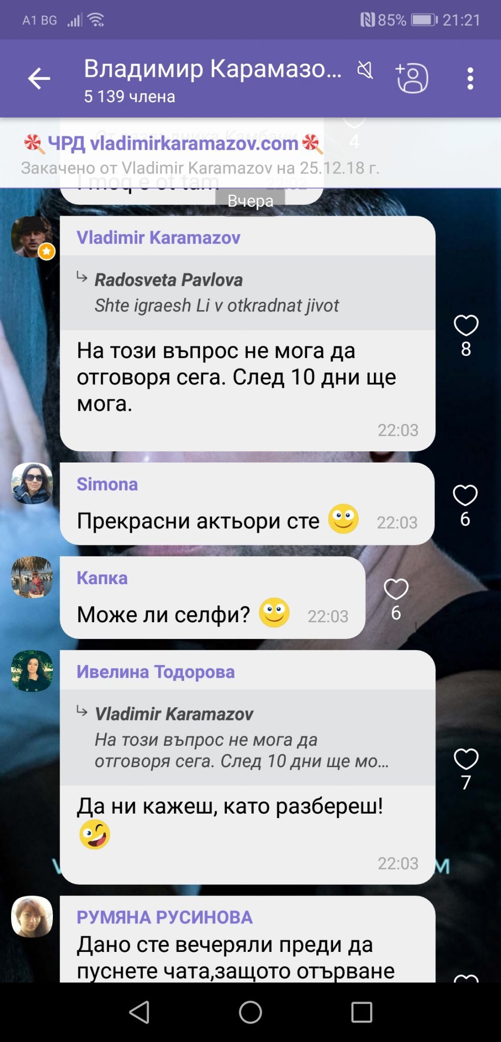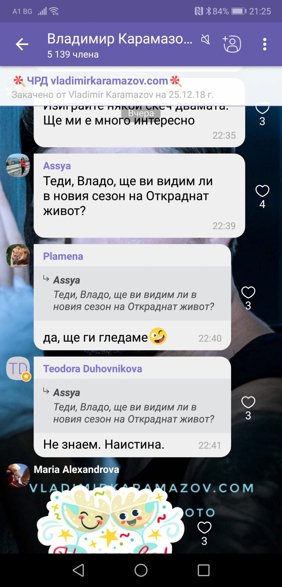 Снощи Карамазов е отворил за малко къмюнитито си във Вайбър и с Т. Духовникова са отговаряли на въпроси - лични и за ОЖ и Дяволското гърло. За ОЖ на въпрос дали ще участват в новия сезон и двамата са отговорили, че още не знаят. Също така Владо е споделил, че догодина го очаква голям филмов проект, поради което няма да участва в нови постановки с Теодора /това второто в отговор на друг въпрос, но пак свързано с предстоящия ангажимент/.