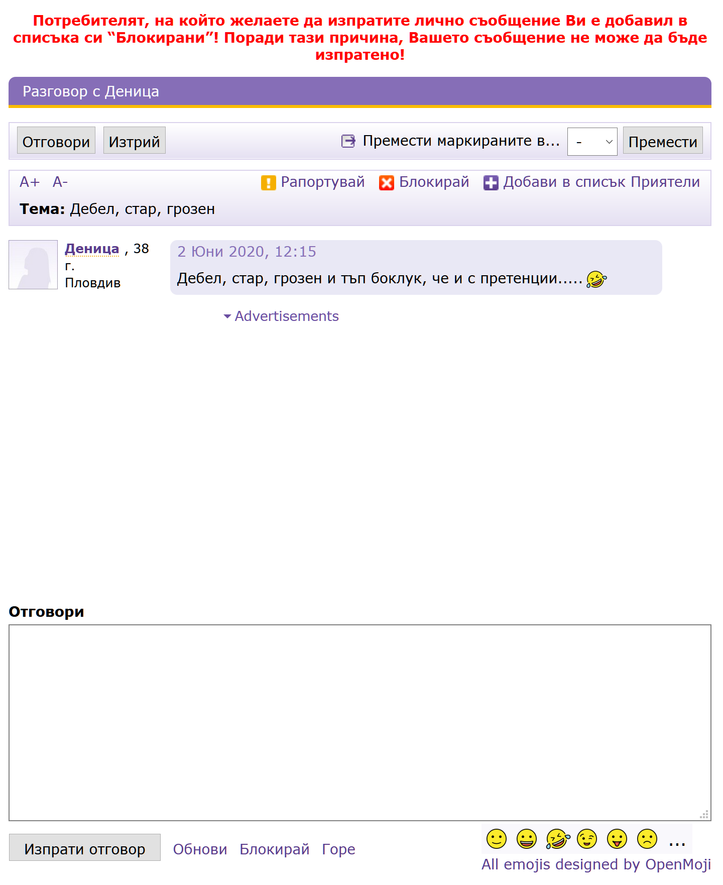 Преди 2 седмици още една подобна ми писа, макар че нито някога съм писал с нея, нито имам профилна снимка, нито съм пращал снимки в близките седмици. Ей така - плюе, каквото плюе, и после си бие камшика. Simple Smile