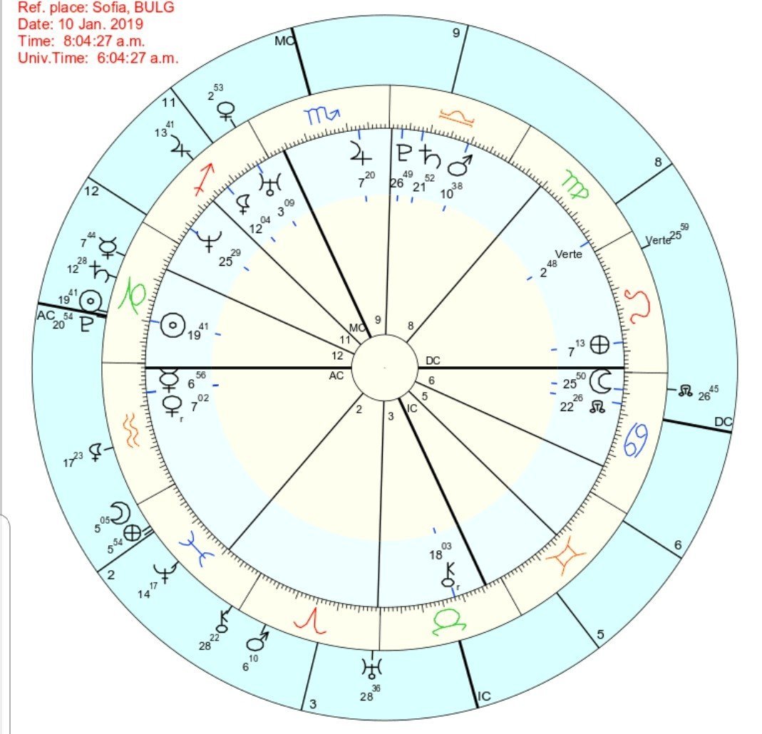 Юпитер на трон в 9 дом не е най-същественото при теб сега. Интересува те кариерната тема, но имай предвид, че му предстои ретроргадие през април на по-малко от градус от МС и ще се наложи да преосмислиш целите и посоките си. След това към ноември, може би, когато застане на МС -  ще квадратира нат.Марс. Също така в 10 дом имаш Уран. Би следвало да усетиш ингреса му в Телец (със заточената си Венера в 1 дом), който ще в края на март, когато Юпитер вече ще забавя своя ход преди ретроградието си. Лятото - Слънчево затъмнение върху Юпитер (4 дом) и след това Лунно затъмнение върху Сатурн (10 дом). В началото на 2020 - сатурнов възврат в съвпад с Плутон.