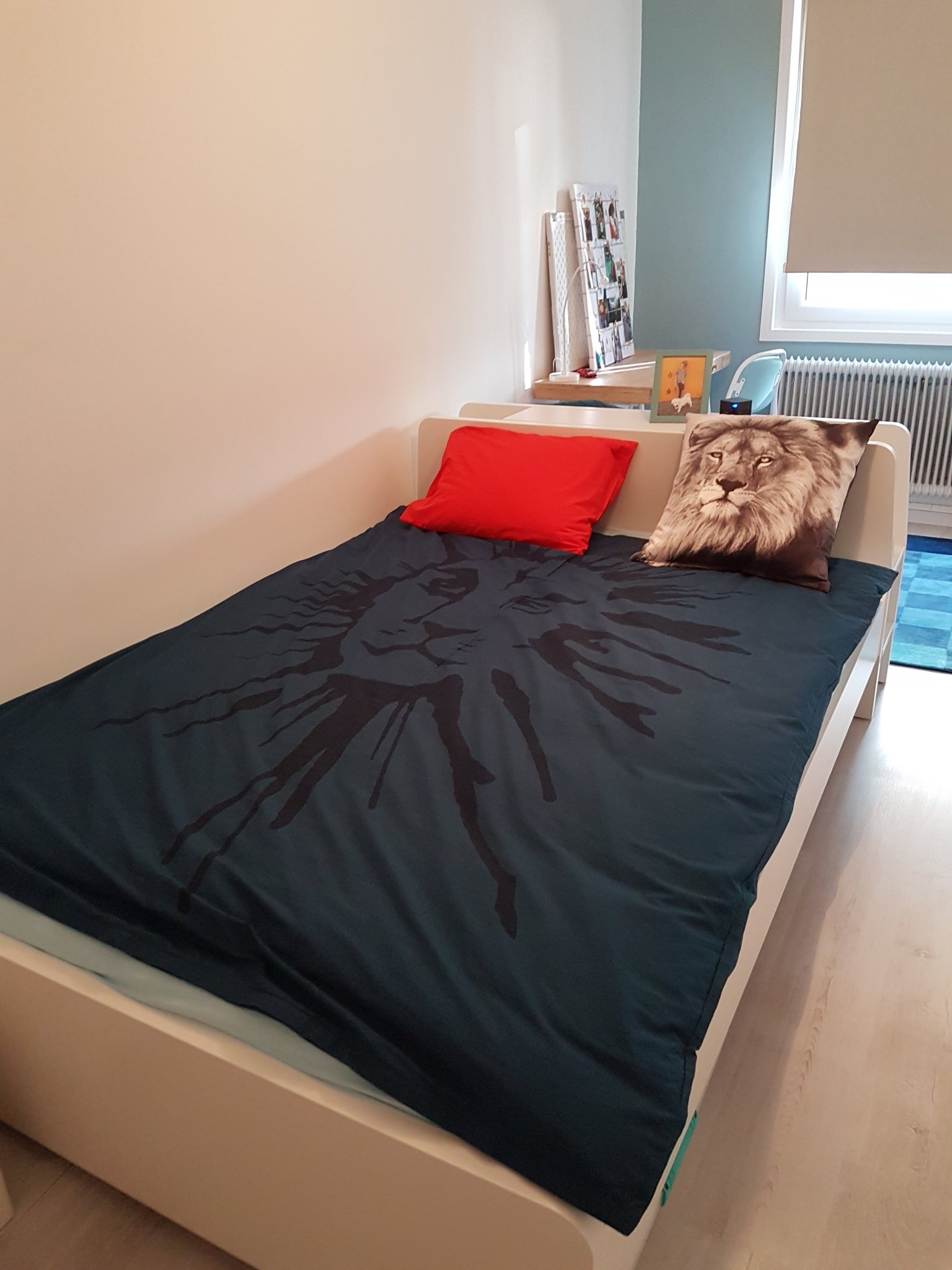 Ако ще е ежедневно разтягане, а няма детето да спи на малката част, пък само ако идват гости да е разпънато...наистина този вариант ще те изнерви с времето. Не знам какъв съвет да дам, аз казах ние какво направихме и в двете ни стаи. Стаята тук е 13 квадрата и леглото седи все едно заема цялата стая 140 на 200..но не ме тревожи, защото децата обичат и на него и под него и изобщо нявсякъде се играе...няма да стои и да не го барат, качват се и не се губи място за игра според мен. Ще опитам да прикача снимки как стана тази стая в Австрия. Другата в Бг ни е огромна, защото е къща и тогава всичко може човек да направи...