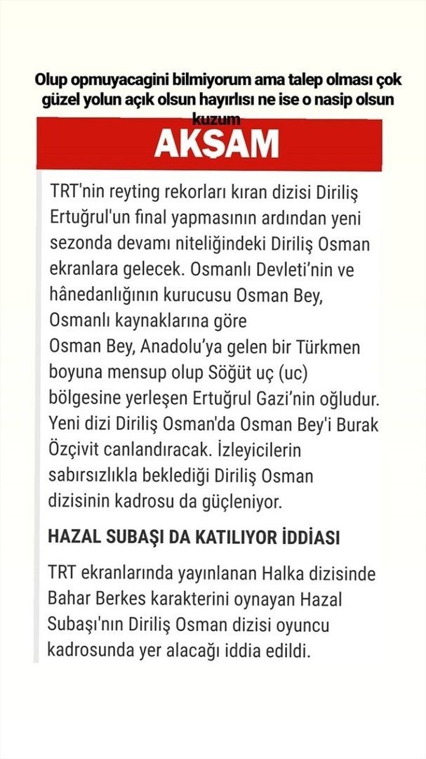 Вера, не е невъзможно едновременно участие, ако ролите не са главни. Не знаем Алина Боз в каква роля ще е в сериала на Нетфликс "Любов 101", а Ердал участва в документална драма и в "Халка". Като се има предвид, че голяма част от сценария на "Възроденият Осман" ще е измислена /почиваща на легенди/, авторите ще имат предостатъчно свобода при създаването на герои. Осман е имал една съпруга, майката на престонаследника Орхан, могат да му измислят още жени. Каквито сигурно е имал. Но при този продуцент и сценарист жените няма да са в центъра на действието. А и нали все пак става дума за създателя на Османската империя, традицията от "Възроденият Ертуурул" ще продължи.