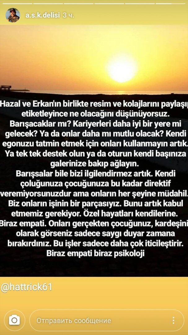 Снимката за която предполагате, че е текст от мениджърите, е от фенски профил и се отнася за колажите, които се правят с Хазал и Еркан като се вземат снимки от профилите им. Хазал е блокирала няколко от последователите си по тази причина.