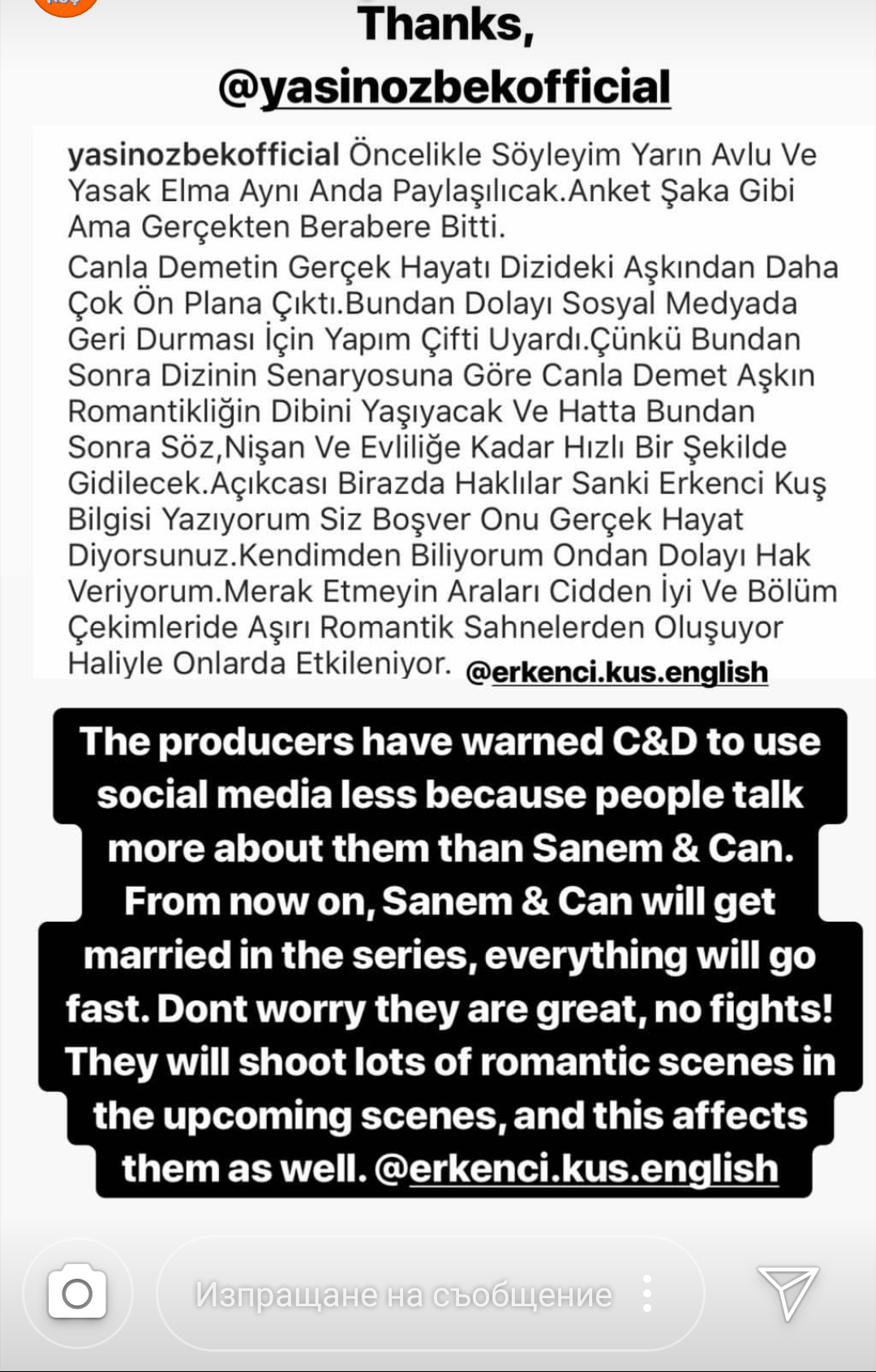 С две думи Д$Д са били предупредени да използват по малко социалните медии защото повече се говори за тях отколкото за Джан и Санем. Ще има още много романтични моменти между тях.