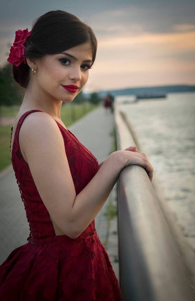 Ето едно хубаво момиче с красива рокля, но не знам за какво му е било да сложи и снимка само на гърдите си: