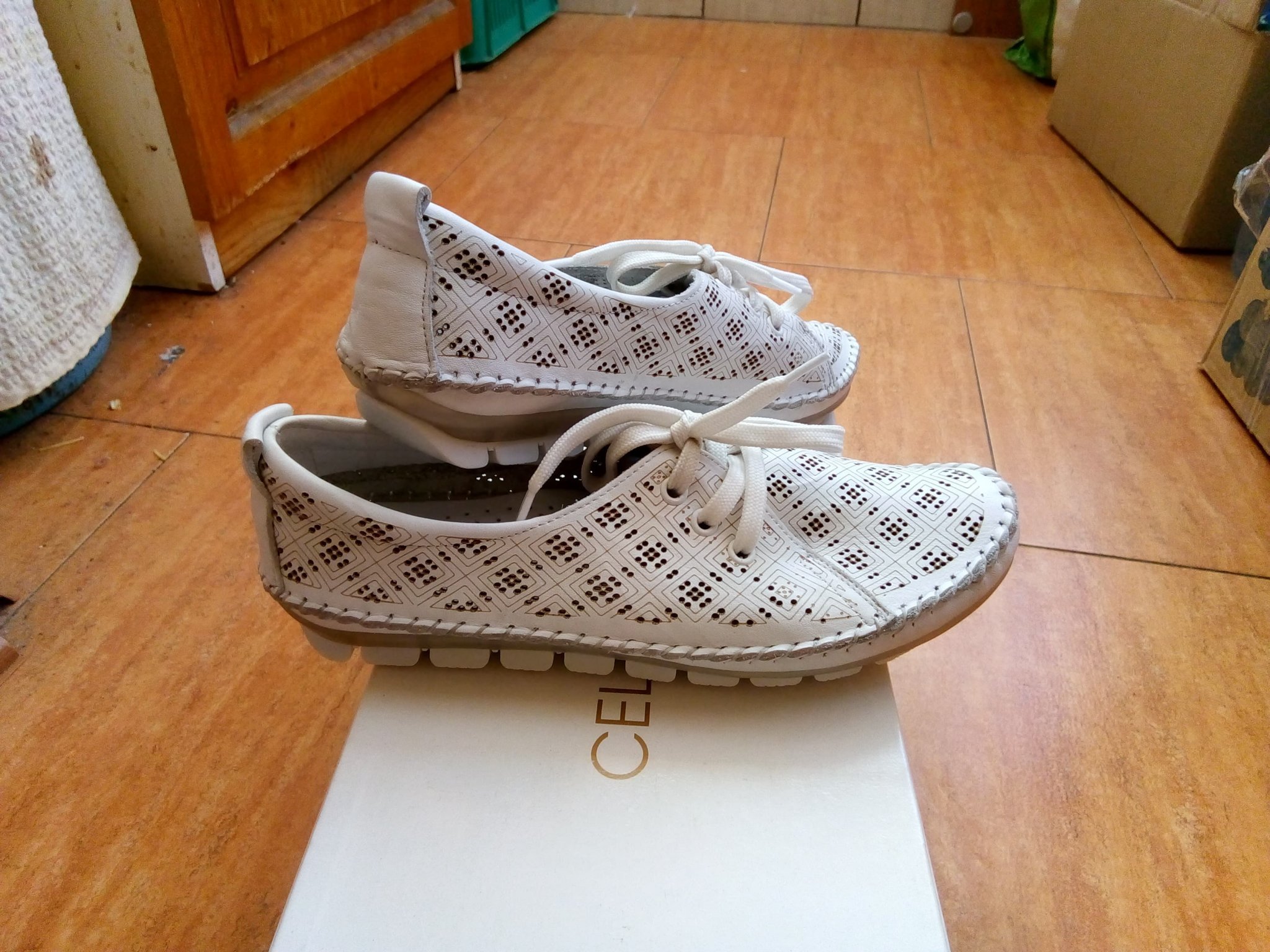 Дамски мокасини естествена кожа отвън и отвътре, 39 номер, но са умалени с един размер и отговарят на 38. Дължината на стелката е 24.5 см. Обувките са с олекотено, ортопедично ходило и са много удобни и красиви. За съжаление на мен се оказаха малки.