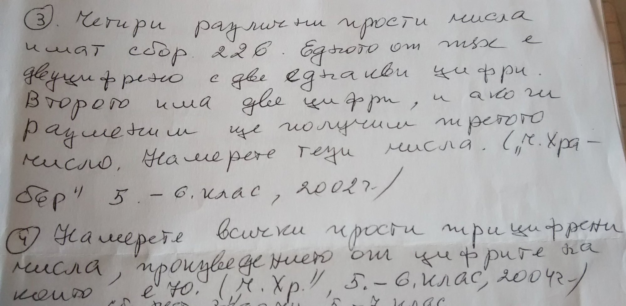 Зад.4: 70=2.5.7 - тъй като които и две прости числа от 2,5 и 7 да вземем произведението им не може да е цифра на числа, то лесно се съобразява, че в записа на трицифирените числа трябва да участва 2, 5 и 7 точно по веднъж. Ако завършва на 2 или 5 няма да е просто. 257 - просто, 527=17.31 и не е .